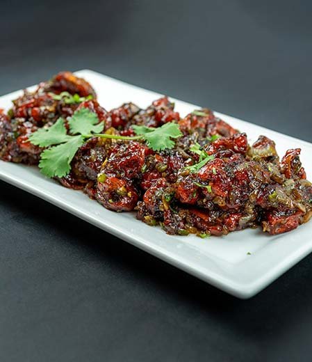 In the dry version, boneless chicken pieces are marinated in a mixture of cornflour, soy sauce, and ginger-garlic paste, then deep-fried and tossed with sautéed onions, bell peppers, green chilies, and a light coating of sauce—ideal as a starter. The gravy version includes a thicker, tangy-sweet sauce with added water or stock, making it perfect to pair with fried rice or noodles.