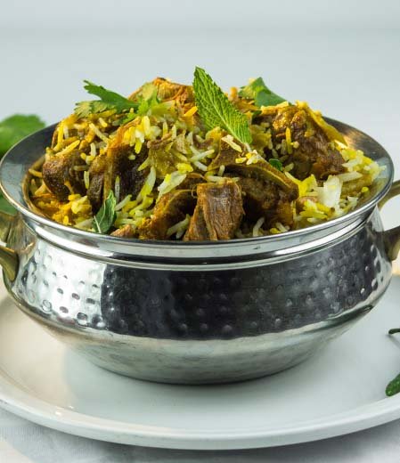 Goat Biryani is commonly served with raita, boiled egg, and salna or gravy across Madurai, Coimbatore, and Malabar, and remains a favorite celebratory meal for Indian families in Mississauga, Brampton, and Scarborough.