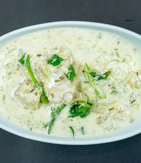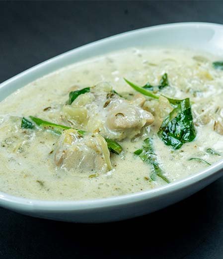 Bone-in goat pieces are slow-cooked with onions, ginger, garlic, green chilies, and whole spices like cardamom, cinnamon, and cloves. The base is enriched with thick coconut milk, which gives the stew its creamy consistency and gentle sweetness. A final tempering of curry leaves and coconut oil adds a distinctly Kerala aroma.
