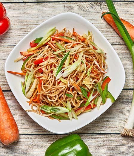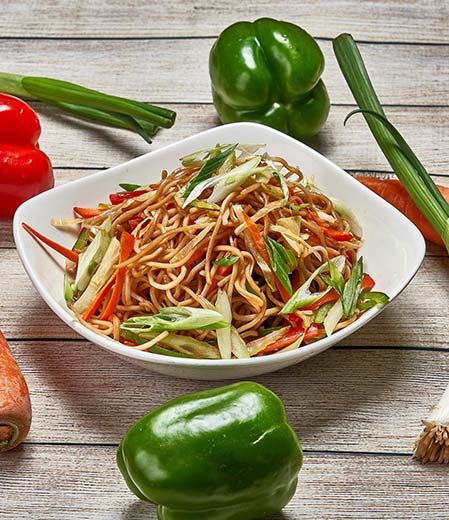 Prepared with boiled noodles tossed over high heat, the dish includes marinated chicken strips, carrots, cabbage, and spring onions sautéed with garlic, soy sauce, and a touch of pepper. The result is a perfectly balanced meal that captures the essence of Indo-Chinese street-style cooking — flavorful, aromatic, and wholesome.