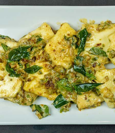 Spicy dry-fried paneer tossed with Kerala bird’s eye chilies, shallots, and curry leaves—fiery, bold, and coconut-oil infused.