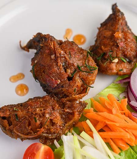 This dish features bone-in or boneless chicken pieces cooked with a roasted spice blend made from fennel, black pepper, coriander, and dry red chilies. Onions, garlic, curry leaves, and crushed ginger form the base, which is sautéed in sesame or groundnut oil until caramelized. The chicken is slow-roasted in this masala until it turns dark, rich, and aromatic with minimal moisture.