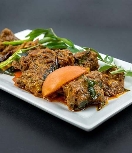 A slow-roasted goat dish from Kerala’s Malabar region, rich with spices, curry leaves, and caramelized onion masala.