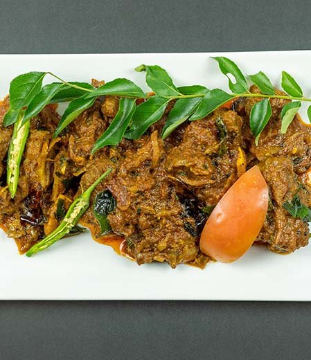 Tender goat meat is marinated with turmeric, chili powder, crushed pepper, and ginger-garlic paste, then slow-cooked in a thick masala made from caramelized onions, tomatoes, garam masala, and curry leaves. The dish is reduced until the masala clings to the meat, creating a dry, pan-roasted texture with layers of bold, smoky flavor. A final touch of coconut oil and fresh coriander enhances the aroma.