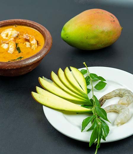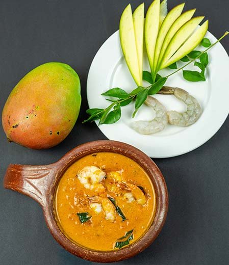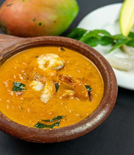 A Kerala coastal curry made with prawns, raw mango, coconut, and green chilies—mildly sweet, tangy, and aromatic.