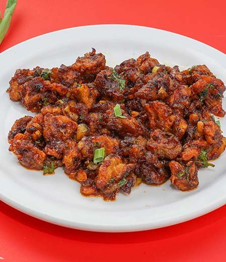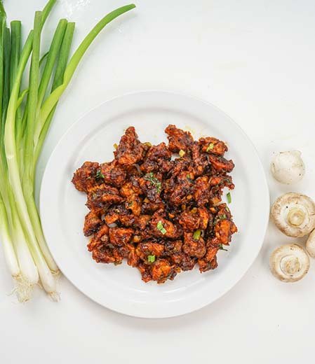 Whole or halved button mushrooms are coated in a cornflour-based batter, deep-fried until crisp, and then stir-fried on high heat with garlic, green chilies, ginger, capsicum, and spring onions. A quick toss in soy sauce, chili sauce, and vinegar gives the mushrooms their signature glossy coating and sharp flavor, balanced with a sprinkle of black pepper or crushed red chilies.