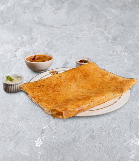 The batter is spiced with black pepper, cumin seeds, chopped green chilies, ginger, and curry leaves, and often includes onions or fresh coriander. Poured onto a hot griddle in a free-flowing motion, Rava Dosa develops its signature crisp edges and netted surface, delivering a light yet flavorful bite.