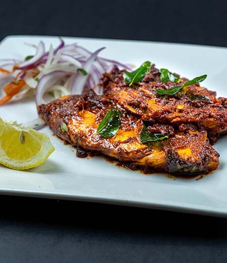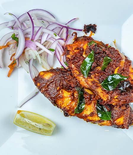 The fish—typically seer, pomfret, or sardine—is marinated in a blend of red chili powder, turmeric, black pepper, lemon juice, and crushed garlic. It is then shallow-fried or grilled on a hot tawa with coconut or gingelly oil until golden brown and lightly charred. A final garnish of curry leaves or sliced onions adds freshness and aroma.